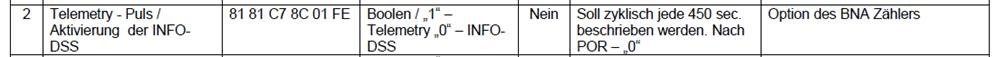 Mit diesem Steuerkommando und Inhalt „1“ wird für 450s die Info-DSS auf Telemetrie geschaltet, nach Ablauf der 450s wird automatisch wieder auf DSS umgeschaltet. Soll die Telemetrieausgabe länge oder permanent erfolgen, dann muss das Steuerkommando innerhalb der 450s wiederholt werden und gilt ab dann erneut für 450s. Mit PowerOnReset wird wieder auf „0“ = DSS-Betrieb zurückgeschaltet. Die temporäre Einstellung auf Telemetrie kann nicht dauerhaft gespeichert werden.