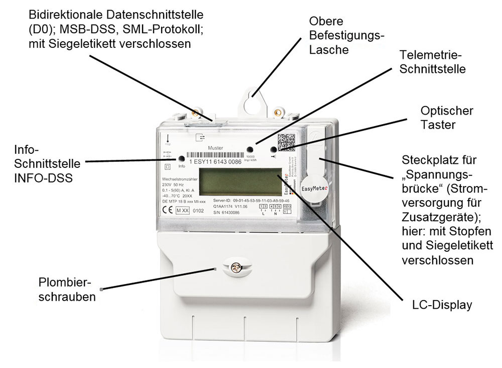 Die Zählergehäuse sind versiegelt und nicht zu öffnen. Hinweis: Die mechanischen Schnittstellen, die Spannungsschnittstellen und die D0-Schnittstelle sind nicht patentiert oder herstellerseitig geschützt. Auf Wunsch werden weitere Detailzeichnungen und Spezifikationen zur Verfügung gestellt. Die Geräte weisen eine bidirektionale D0-Schnittstelle nach DIN EN 62056 auf, welche Daten in Form des SML-Protokolls ausgibt (Smart Message Language).