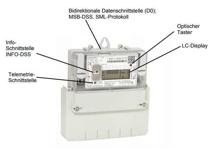 Die Zählergehäuse sind verschweißt und als „Sealed-forever“ Geräte ausgeführt. Hinweis: Die mechanischen Schnittstellen, die Spannungsschnittstellen und die D0-Schnittstelle sind nicht patentiert oder herstellerseitig geschützt. Auf Wunsch werden weitere Detailzeichnungen und Spezifikationen zur Verfügung gestellt. Die Geräte weisen eine bidirektionale D0-Schnittstelle nach DIN EN 62056 auf, welche Daten in Form des SML-Protokolls ausgibt (Smart Message Language).