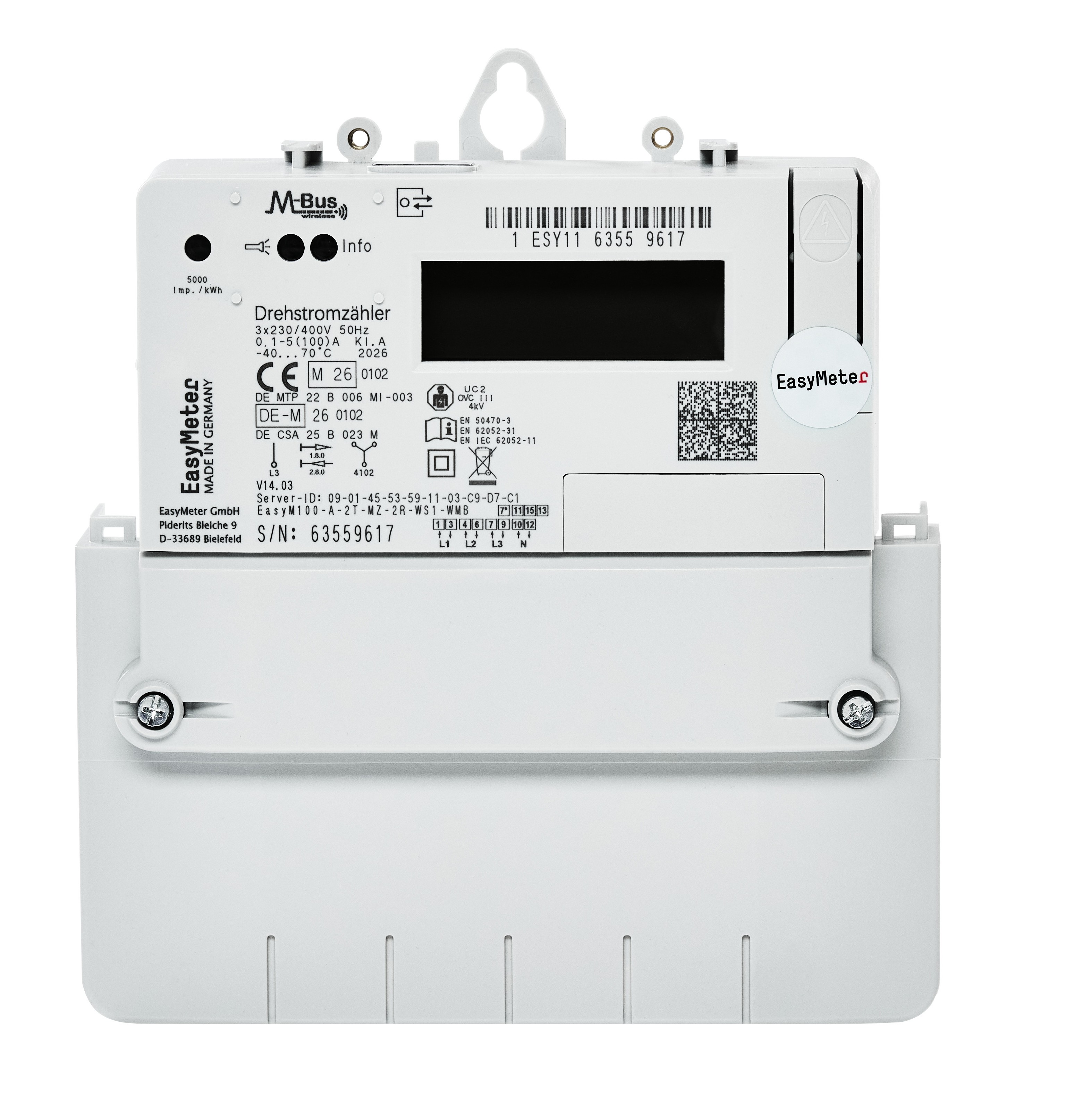 Kompakter 3-Phasen-, 4-Leiter-Wirkleistungszähler, auch als 1-Phasen-, 2-Leiter-Zähler einsetzbar, Strombereich 0,1-5(60) A (Variante „EasyM60“) oder 0,1-5(100) A (Variante „EasyM100“), Universelle Käfigzugklemmen, Innenschaltung 4000, 4100 oder 4102 nach DIN 43856, mit Metalleinlage für frontseitigen Magnet-Tastkopf